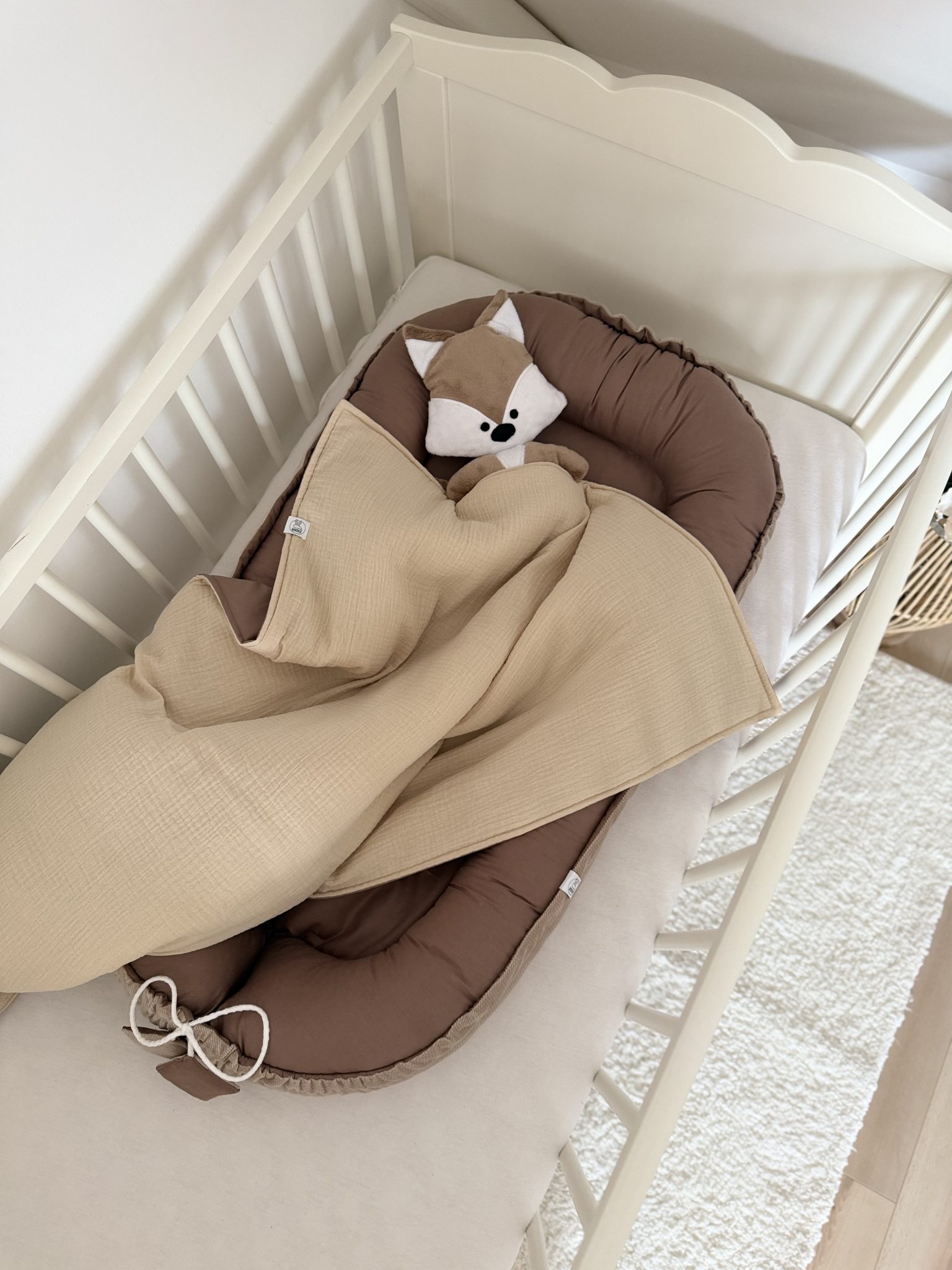 100% Pamut és pihe-puha Velvet anyagból készült prémium babafészek, amely az anyaméhhez hasonló biztonságérzetet nyújt babádnak. Emlékezteti őt a pocakodban eltelt 9 hónapra. Ölelő érzetet ad, így könnyebben megnyugtathatja őt.